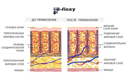 В процессе коррекции фигуры аппаратом B-flexy в клетках кожи происходят революционные изменения: в подкожном слое начинается эффективный синтез коллагена, образуется новый слой кожи с правильной структурой.