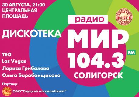 Команда радио «Мир» едет в Солигорск, чтобы поздравить жителей города с праздником! 30 августа в День города на Центральной площади пройдет дискотека радио «Мир». Весь вечер на сцене только звезды! Диджеи Катя Пытлева и Константин Юманов, группа Лас Вегас, Лариса Грибалева, Ольга Барабанщикова и главный музыкальный герой года – ТЕО! Конкурсы, подарки, хорошее настроение и много сюрпризов...