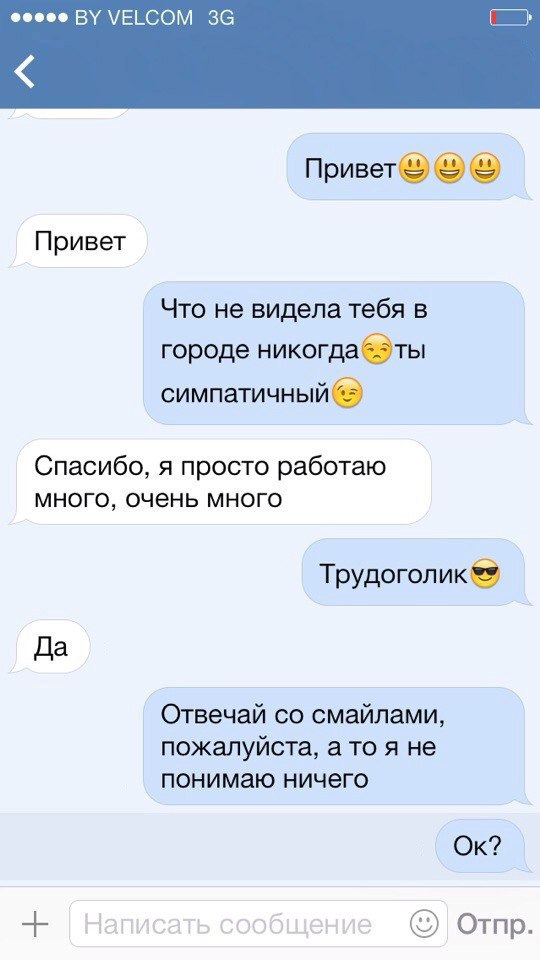 А вот история девушки, которая хотела шуткой показать молодому человеку, что его предложение о встрече очень размыто, и следует договориться конкретнее. "Мой неудавшийся кавалер шутку не оценил, наверное, в его случае нужно было не только смайлики поставить, но и в скобках "шутка" написать", - поделилась с нами Кристина.