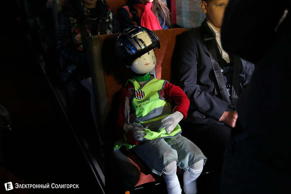 Автобус укомплектован генератором дыма для имитации задымления салона, наглядными материалами и мультимедийной аппаратурой для демонстрации обучающих фильмов. На выходе всем детям вручали фликеры и памятки о том, насколько важен ремень безопасности.