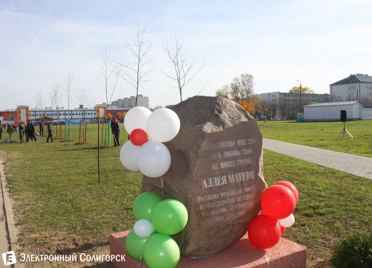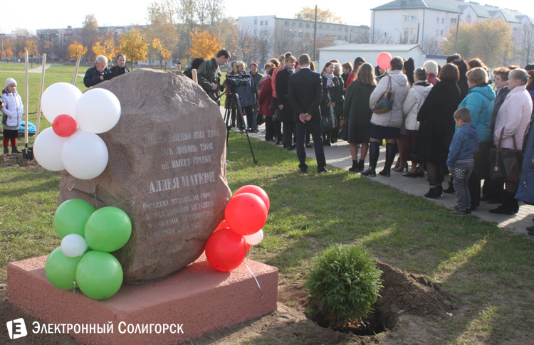 Напомним, Аллея матери в Солигорске была заложена в 2001 году, когда солигорскими женщинами, имеющими материнские награды, были высажены молодые деревья, а расширена была в 2006 году. Однако в связи со строительством на данном участке торгового центра "Корона" значительная часть Аллеи не сохранилась. Некоторые деревья вместе с памятным знаком были перенесены на улицу Октябрьскую, а оставшиеся рябинки остались стоять без должного присмотра на Железнодорожной.