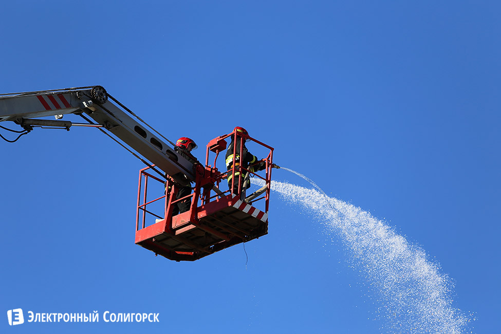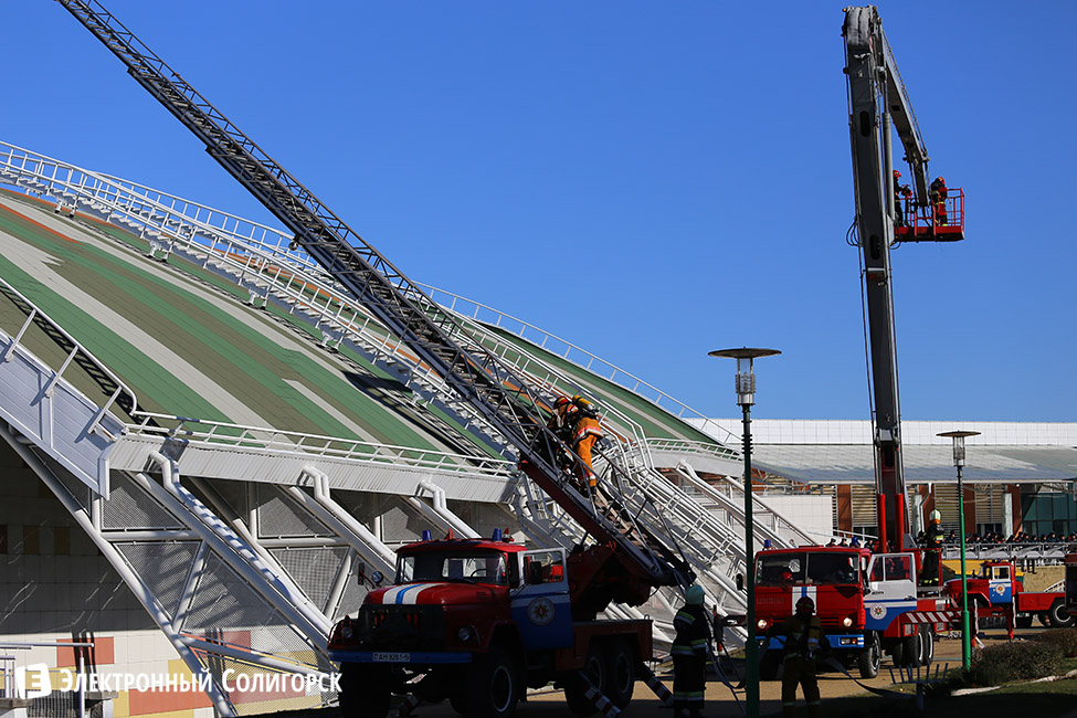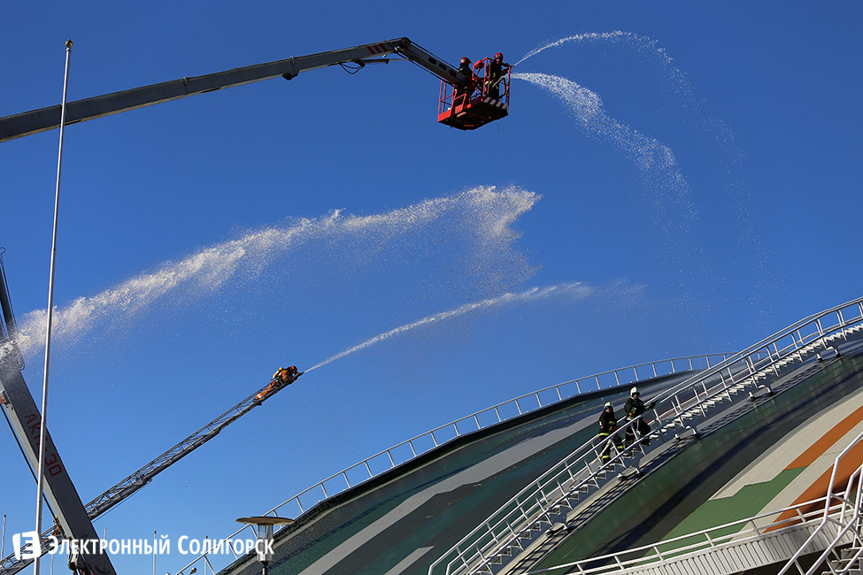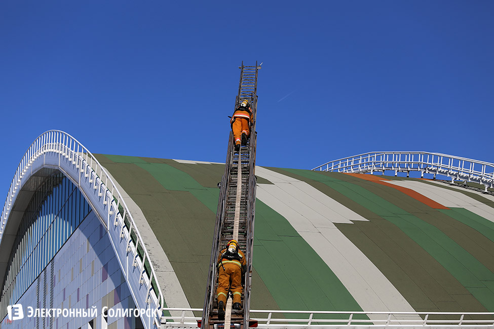 Отработали спасатели действия по удалению дыма из ледовой арены, была проведена работа по тушению огня в задымленном помещении. Последний этап – ликвидация загорания кровельного покрытия.