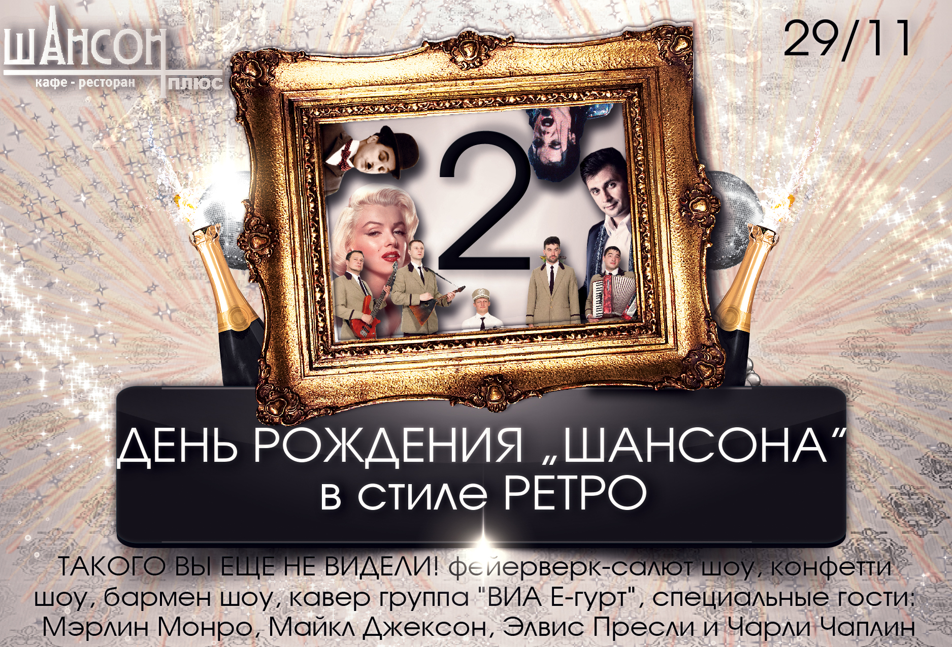 Считанные дни остались до самого ожидаемого события этого года в ночной жизни города - второго по счету Дня Рождения кафе-ресторана "ШАНСОН", которое, напомним, состоится 29 НОЯБРЯ в 20.00 ! Праздник пройдет в ретро стиле и атмосфере безудержного веселья, драйва и позитива. Заявленная программа поистине впечатляет своим разнообразием и размахом: