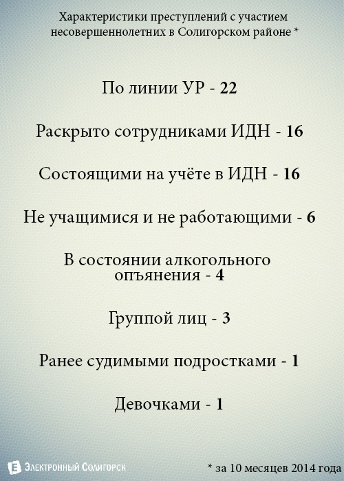 Согласно данным инспекции по делам несовершеннолетних Солигорского РОВД, на дату 01.11.2014 на учете в инспекции состоит 286 несовершеннолетних, то есть 18 подростков на одного инспектора. Стоит заметить, что по сравнению с аналогичным периодом 2013 года количество преступлений, совершенными несовершеннолетними, незначительно, но снизилось с 27 до 24 случаев.