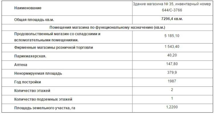 Предмет аукциона представляет собой здание общей площадью 7296,4 кв.м и земельный участок площадью 1,2200 га для обслуживания и эксплуатации здания магазина, включая многолетние насаждения – сосны и живую изгородь (арония).