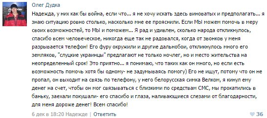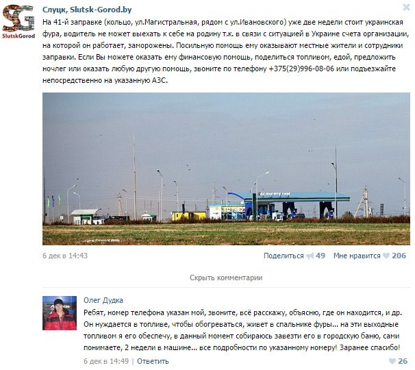 Первым неравнодушным человеком, встретившимся на пути дальнобойщика Олега оказался случчанин Олег Дудка, который не только лично помог попавшему в затруднительное положение тезке, обеспечив его топливом на выходные, накормив и, в лучших традициях душевных новогодних фильмов, сводив его в баню, но и разместил 6 декабря в одном из слуцких пабликов вконтакте такой вот пост: