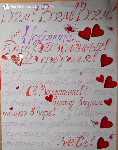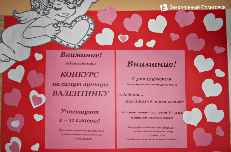 Также, в эти дни, в рамках празднования Дня всех влюблённых, в школе №2 проходят конкурс на лучшую "валентинку" и фотоконкурс "Любовь... Как много в этом слове...".