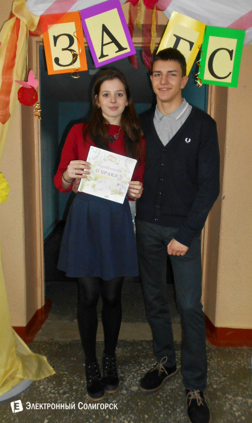 А ещё, как вы могли прочесть на объявлении выше, в школьном ЗАГСЕ можно было "узаконить" отношения. В правду иль в шутку, но такие, кому захотелось получить документ о скреплении любящих сердец, заверенный самим Купидоном, нашлись! Вот эта пара.