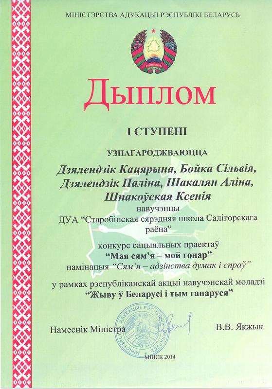 Совместный проект педагогов и учащихся Старобинской средней школы "Круг семьи" одержал победу в республиканском конкурсе социальных проектов "Моя семья - моя гордость", который проходил в рамках республиканской акции учащейся молодежи “Жыву ў Беларусі і тым ганаруся".