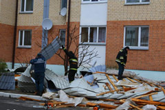 Неподалеку от стадиона пошалил ураган и с жилым домом. Часть крыши на доме № 6 по ул.Октябрьской оказалась сорвана и просто сброшена на землю рядом с подъездами. По предварительным данным, пострадавших нет. Силами сотрудников Солигорского ГРОЧС ведется ликвидация последствий стихии.
