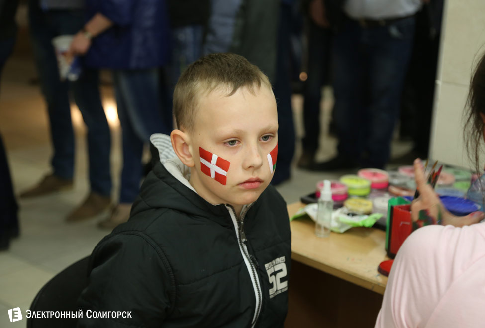 Болельщицкий интерес к международному поединку в Солигорске был довольно высок. Одной из антуражных "фишек" для зрителей всех возрастов стала возможность нанести аквагрим с флагами обеих стран, команды которых были на льду.