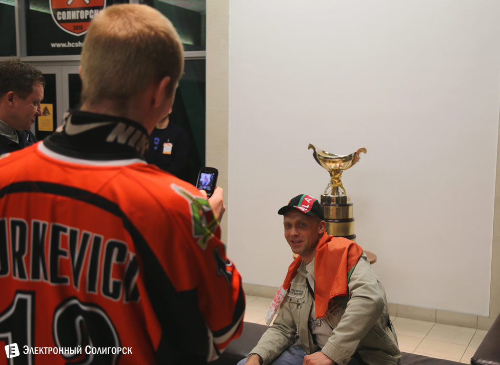 А еще в холле арены был выставлен на всеобщее обозрение Кубок Президента РБ - главный хоккейный трофей страны, завоеванный недавно солигорским "Шахтером". Естественно, спортивная реликвия стала главным объектом для фотографирования и селфи болельщиков.