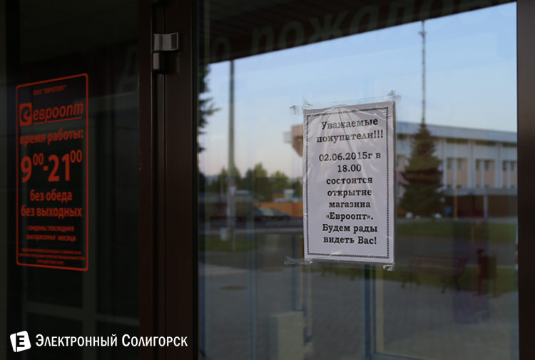 Открытие магазина "Евроопт" на улице Железнодорожной в Солигорске запланировано на 2 июня, как стало известно "Электронному Солигорску". Об этом же гласит и объявление на двери торгового объекта.