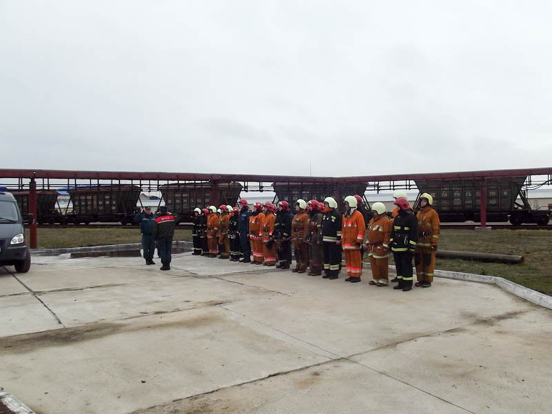 Для проведения ТСУ привлекались 10 автоцистерн, автолестница, автомобиль медицинской помощи, аварийно-спасательный автомобиль, штаб ЛЧС и 37 работников Солигорского ГРОЧС. В ходе проведения учения было проверено противопожарное водоснабжение: 5 ПГ - находятся в исправном состоянии.