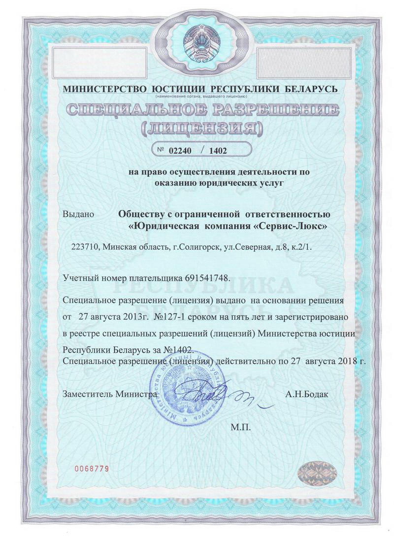 ООО "Юридическая компания "Сервис-Люкс" УНП 691541748