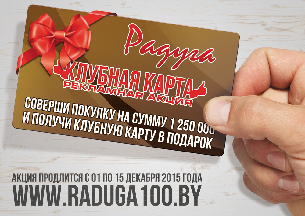 Для жителей г. Слуцка, «Клубные карты» будут выдаваться 18, 19, 20 декабря в супермаркете ТЦ «Радуга» на первом этаже (возле входа), где будет организован пункт по выдаче карт. Для получения карты необходимо предоставить чек на сумму от 1 250 000 руб. и выше.