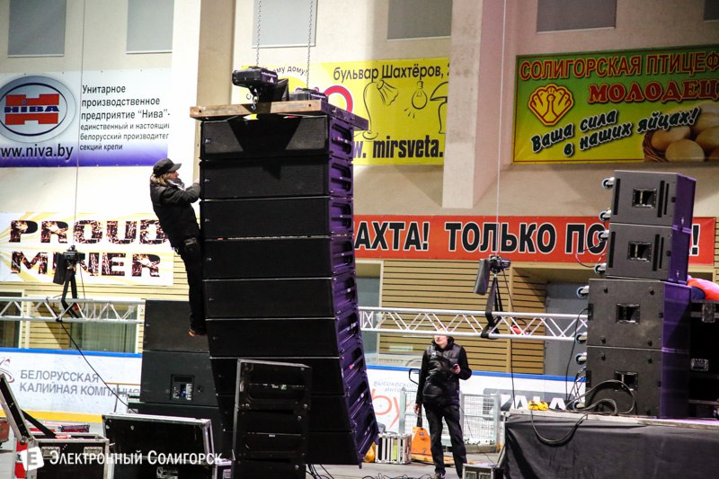 В самом СЗК вечером накануне концерта ледовая площадка постепенно превращалась в концертную. Вот как ведется подготовка помещения для выступления звездного гостя.
