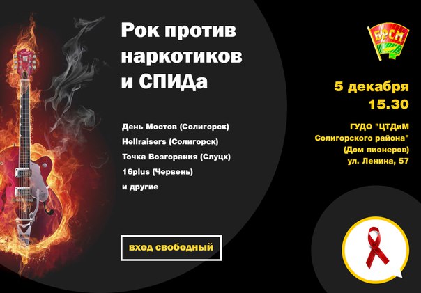 5 декабря в городе Солигорске пройдет ставший уже традиционным ежегодный концерт "Рок против наркотиков и СПИДа". Организаторы мероприятия - Солигорский РК ОО "БРСМ" и ГУДО "ЦТДиМ Солигорского района" (Дом пионеров).