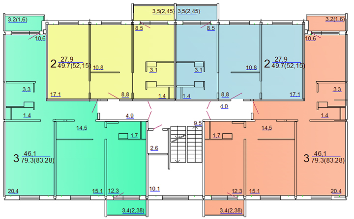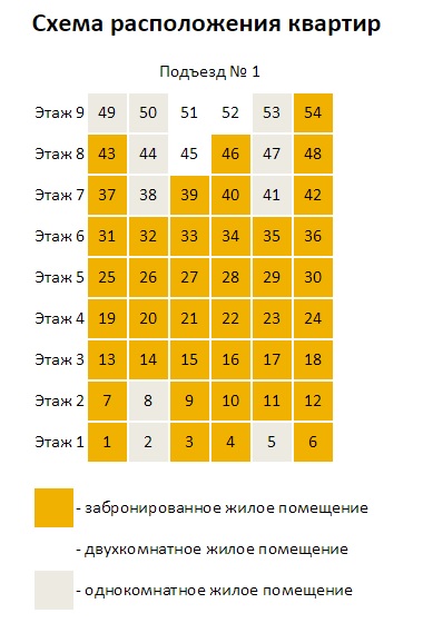 Планировка подъезда №1 (двух, трехкомнатные жилые помещения)