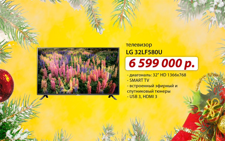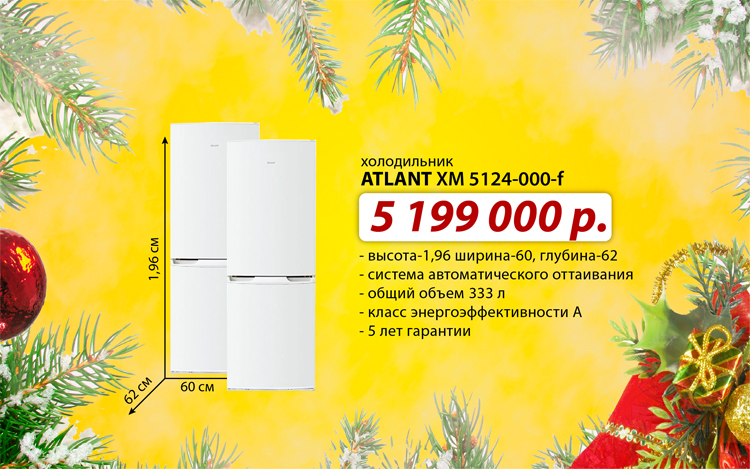 Зимние праздники – время покупать подарки, поэтому мы подготовили для вас действительно привлекательные цены. Телевизор LG SMART TV с диагональю 32’’ всего за 6 599 000 рублей, СВЧ-печь HORIZONT с грилем всего за 1 199 000 рублей. А холодильник ATLANT XM 5124 можно приобрести за 5 199 000 рублей. Цены снижены более чем на 30 товаров. Покупайте выгодно в салонах-магазинах ATLANT!