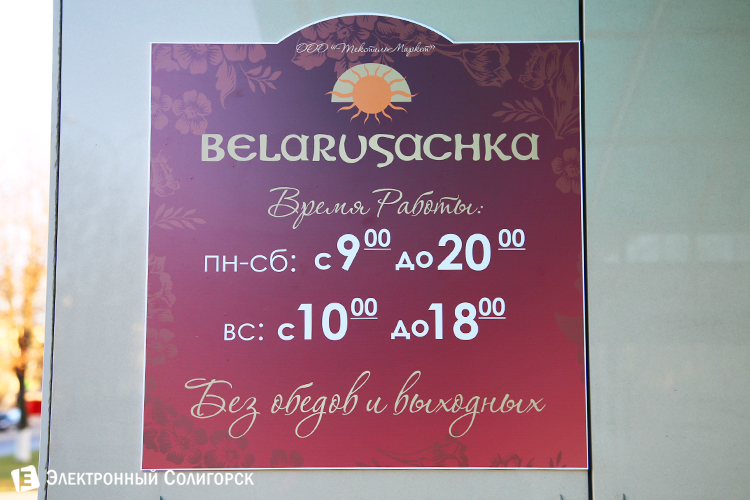 Работает фирменный магазин торговой марки «Беларусачка» без выходных и перерывов с 9:00 до 20:00 (в воскресенье – с 10:00 до 18:00).
