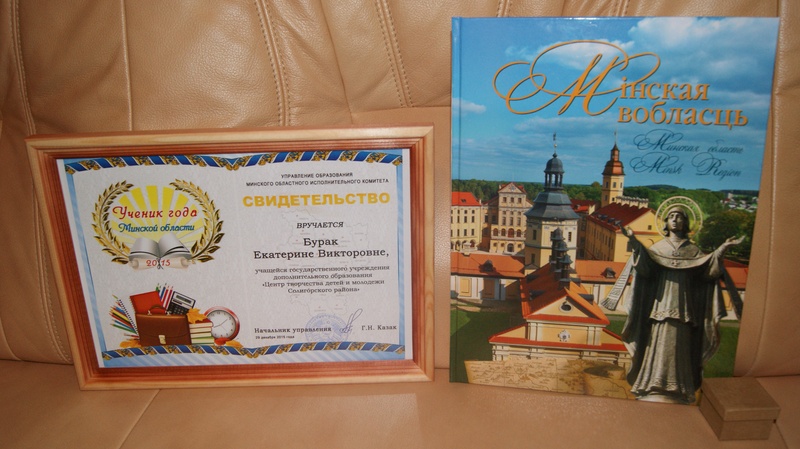 По итогам 2015 года учащаяся объединения по интересам "Декоративная роспись" ГУДО "Центр творчества детей и молодёжи Солигорского района" Бурак Екатерина получила свидетельство управления образования Миноблисполкома "Ученик года Минской области" и отличительный значок.