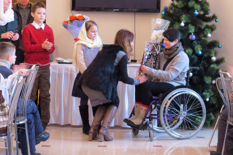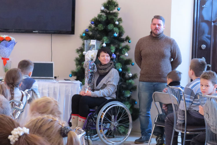 Во время презентации дети задавали вопросы о спорте, об увлечениях своих друзей-колясочников и с большим удовольствием поздравили подарками сделанными вместе с родителями своими руками. Макейчик Ирине были вручены прекрасные цветы от родителей и детей. С поздравлениями и вручением подарков выступило Православное молодежное братство.