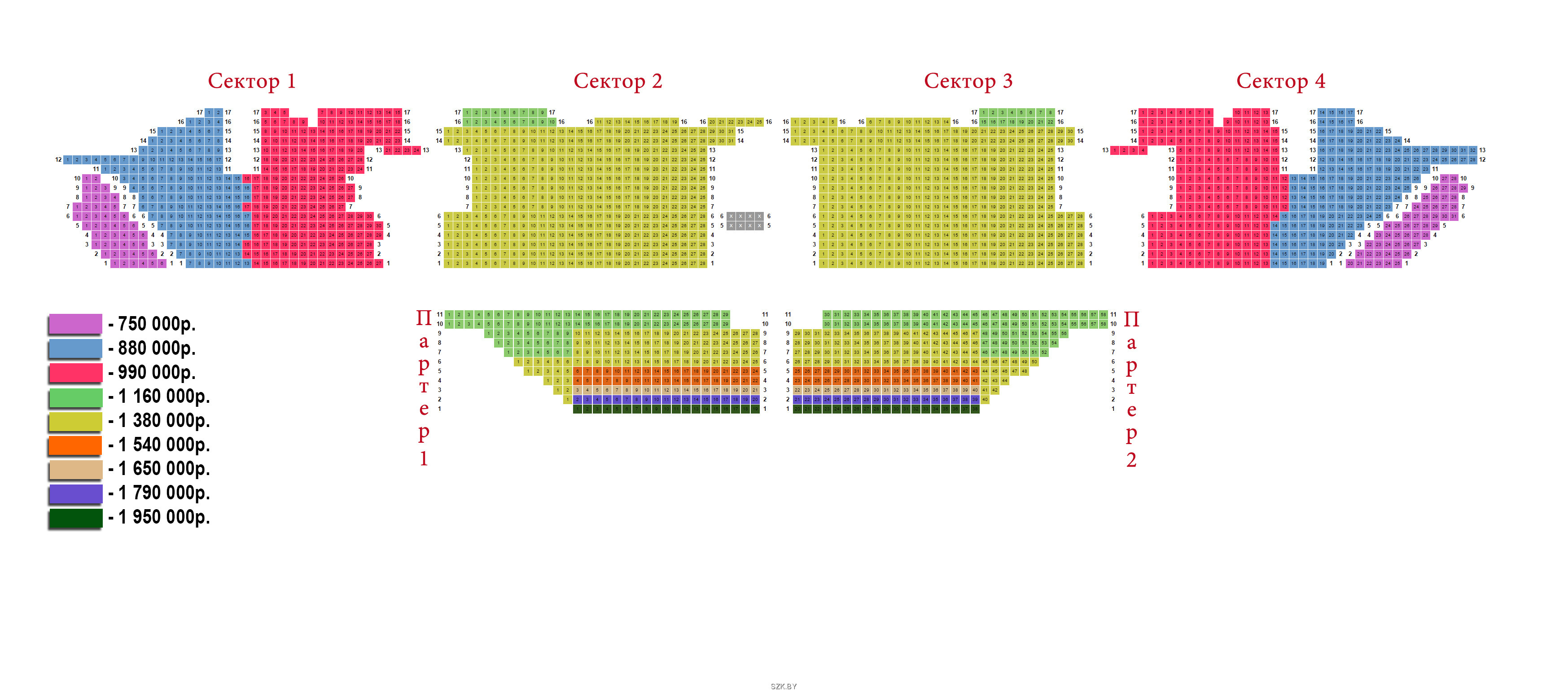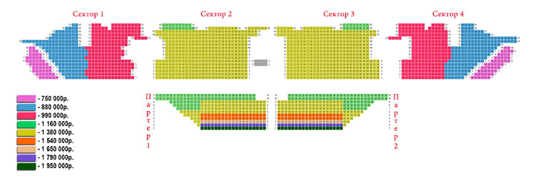 партер – 1 160 000, 1 380 000, 1 540 000, 1 650 000, 1 790 000, 1 950 000 руб.