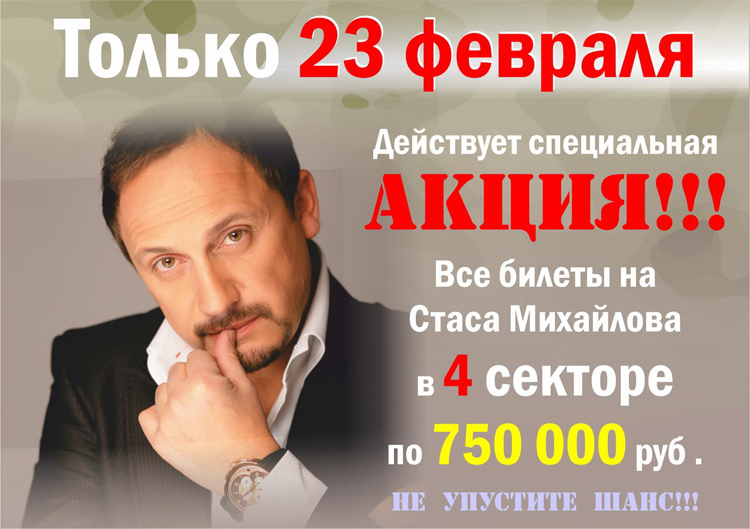 Только 23 февраля в «День защитника Отечества» в кассах Спортивно-зрелищного комплекса все билеты на концерт Стаса Михайлова в 4 секторе можно приобрести по цене 750 000 рублей.