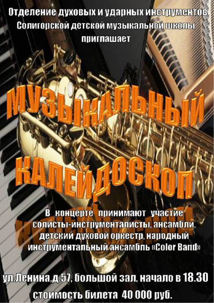 26 февраля 2016 г. отделение духовых и ударных инструментов Солигорской детской музыкальной школы приглашает на концерт «Музыкальный калейдоскоп» - новый творческий проект отделения.