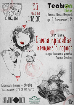 - Театральная мастерская «Следы» (г. Гомель) представляет моноспектакль «Самая красивая женщина в городе» по произведениям и интервью американского писателя-маргинала-философа Чарльза Буковски. Пронзительная история о любви к жизни, к себе, к алкоголю, к женщинам в общем и к самой красивой женщине в городе в частности. Прикрываясь грубостью, грязью, цинизмом и агрессией, герой расскажет о попытке спасения не только самого живого существа в его жизни, но и его собственной, еще живой, души. «Спасение мира начинается со спасения одного-единственного человека...» Ч. Буковски Автор сценария, режиссёр: Александр Курц |