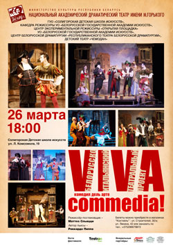 - Также в качестве гостей на фестивале выступит Национальный Академический Драматический театр им. М. Горького со спектаклем «Viva Commedia!» по пьесе специально написанной драматургом Риккардо Пиппа, режиссёр - Маттео Спьяцци (Верона, Италия)! Комедия дель арте (итал. commedia dell'arte), или комедия масок — традиционный вид итальянского площадного театра, спектакли которого создавались методом импровизации, с участием актёров, одетых в маски. Участники и гости фестиваля будут иметь удивительную возможность погрузиться в атмосферу итальянских шуток и страстей! |