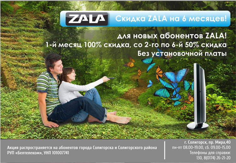 Всем новым абонентам (физическим лицам), подключающимся к услугам интерактивного телевидения ZALA на тарифный план «Премьера» в период по 30.04.2016, предоставляется скидка 100% на установочную плату, скидка 100% на абонентскую плату в течение 1-го месяца и скидка 50% на абонентскую плату в течение последующих 5-ти месяцев с момента подключения услуги.
