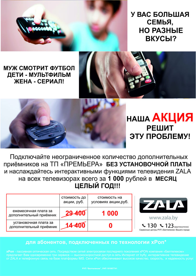 Всем новым и существующим абонентам (физическим лицам) xPON, подключающимся к услугам ZALA на тарифный план «Премьера» предоставляется возможность подключить любое количество дополнительных приемников ZALA по цене 1000 руб. Установочная плата за подключение дополнительных приемников не взимается. Срок действия скидки 12 месяцев с момента подключения. Данное предложение действует по 30.04.2016.