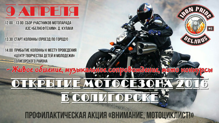 9 апреля состоится открытие мотосезона 2016 в Солигорске. Об этом сообщает паблик MotoLifeSoligorsk.
