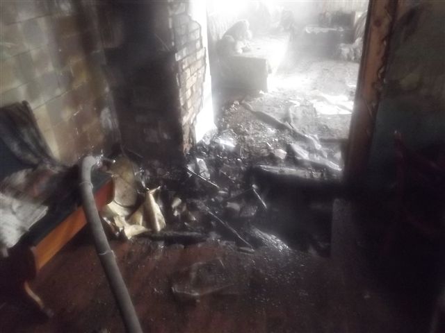 В результате пожара поврежден пол на площади 2м2 в комнате 3х5м, дверная деревянная коробка, дом закопчен.