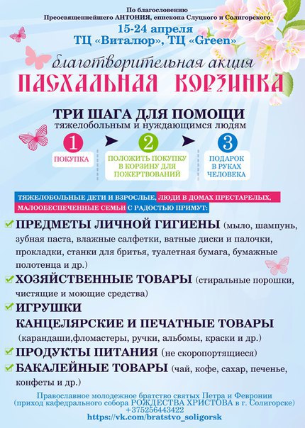 15-24 апреля в супермаркете "Виталюр" и в гипермаркете "Green" будет проходить благотворительная акция "Пасхальная корзинка" по сбору подарков для инвалидов, детей-сирот, малообеспеченных семей, организованная Православным молодежным братством Святых Петра и Февронии Муромских (приход кафедрального собора РОЖДЕСТВА ХРИСТОВА в г. Солигорске).