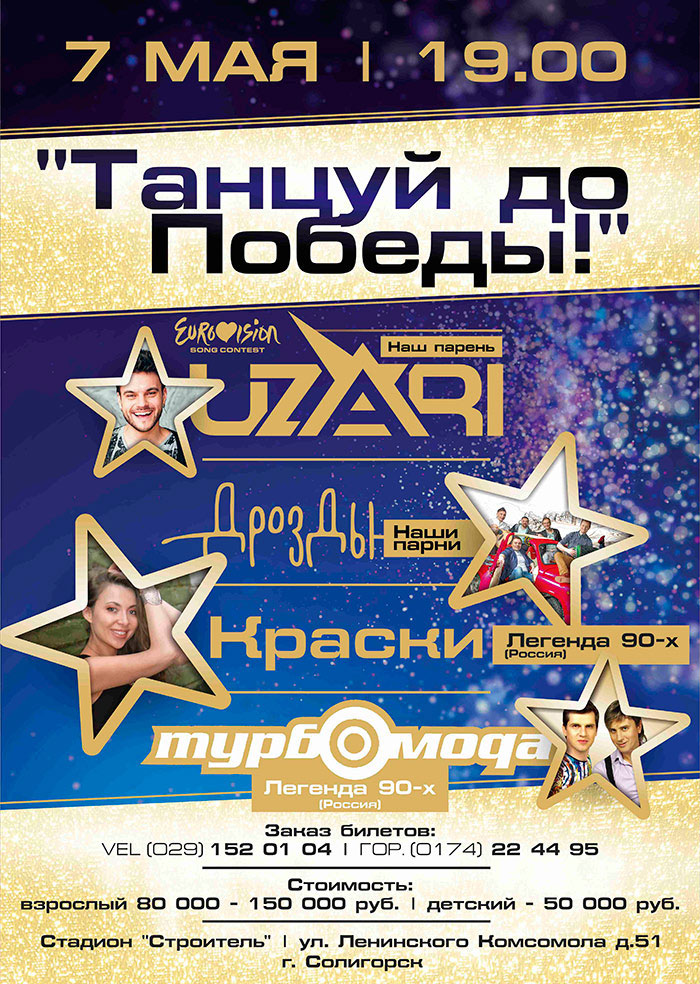 Перед солигорскими зрителями выступают легендарные группы 90-х - "КРАСКИ" и "ТУРБОМОДА" (Россия), яркий представитель современной беларуской поп-сцены - группа "ДРОЗДЫ" и специальный гость праздничного шоу, участник "Евровидения-2015", невероятно артистичный "UZARI"!
