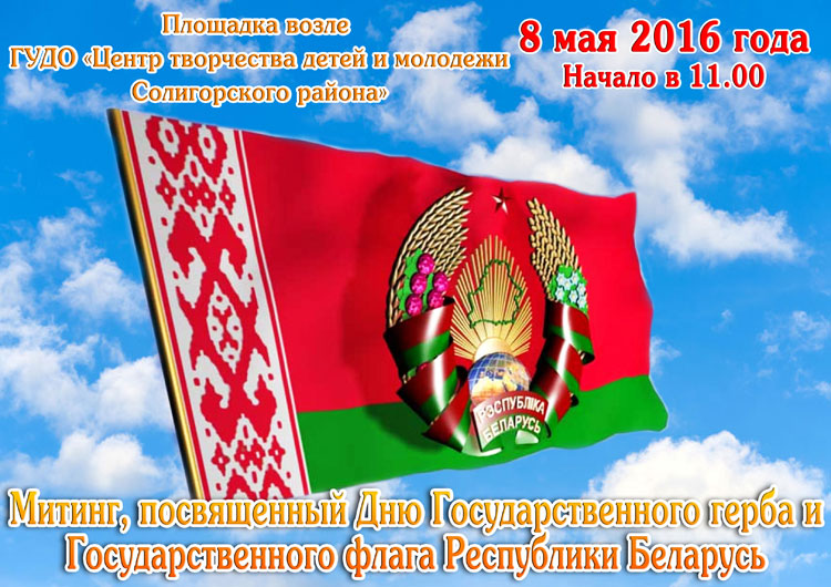 8 мая 2016 в 11.00 на площадке возле ГУДО "Центр творчества детей и молодежи Солигорского района" Митинг, посвященный Дню Государственного герба и Государственного флага Республики Беларусь