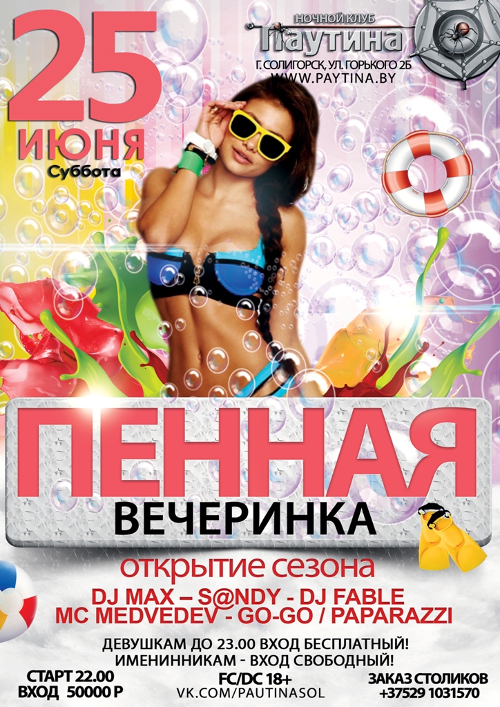 Грандиозное событие в клубе «Паутина»! 25 июня - ПЕННАЯ ВЕЧЕРИНКА! ПЕННОЕ БЕЗУМИЕ! ОТКРЫТИЕ СЕЗОНА! Тонны пены, безумные танцы, девушки в бикини, конкурсы, подарки!