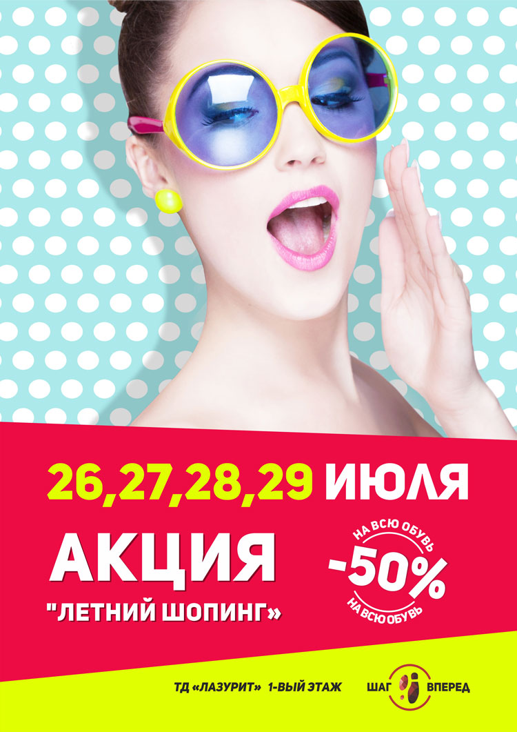 Условия акции "Летний шопинг": скидка 50% на всю обувь только 26, 27, 28 и 29 июля.