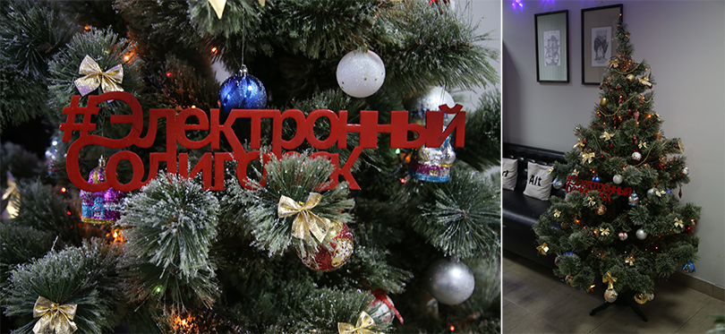 Игрушки одинаковых цветов рядом не вешайте. Располагайте их гармонично. Потом прогуляйтесь по улице, отвлекитесь и свежим взглядом взгляните на елку. Последний штрих – мишура, искусственный снег и пр. Кстати, верхушки уже не в тренде. Взяв во внимание эти советы, вот такая елка получилась у нас в офисе.