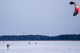 Гонки на санях, кайтсерфинг на водохранилище, каток на стадионе. Морозные кадры последних выходных зимы