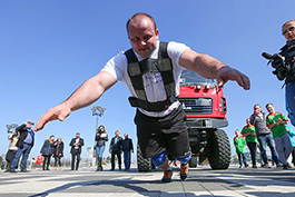 "Солигорский медведь" Александр Курак в паре с другим белорусским силачом протянули на 20 метров 9-тонный гоночный МАЗ