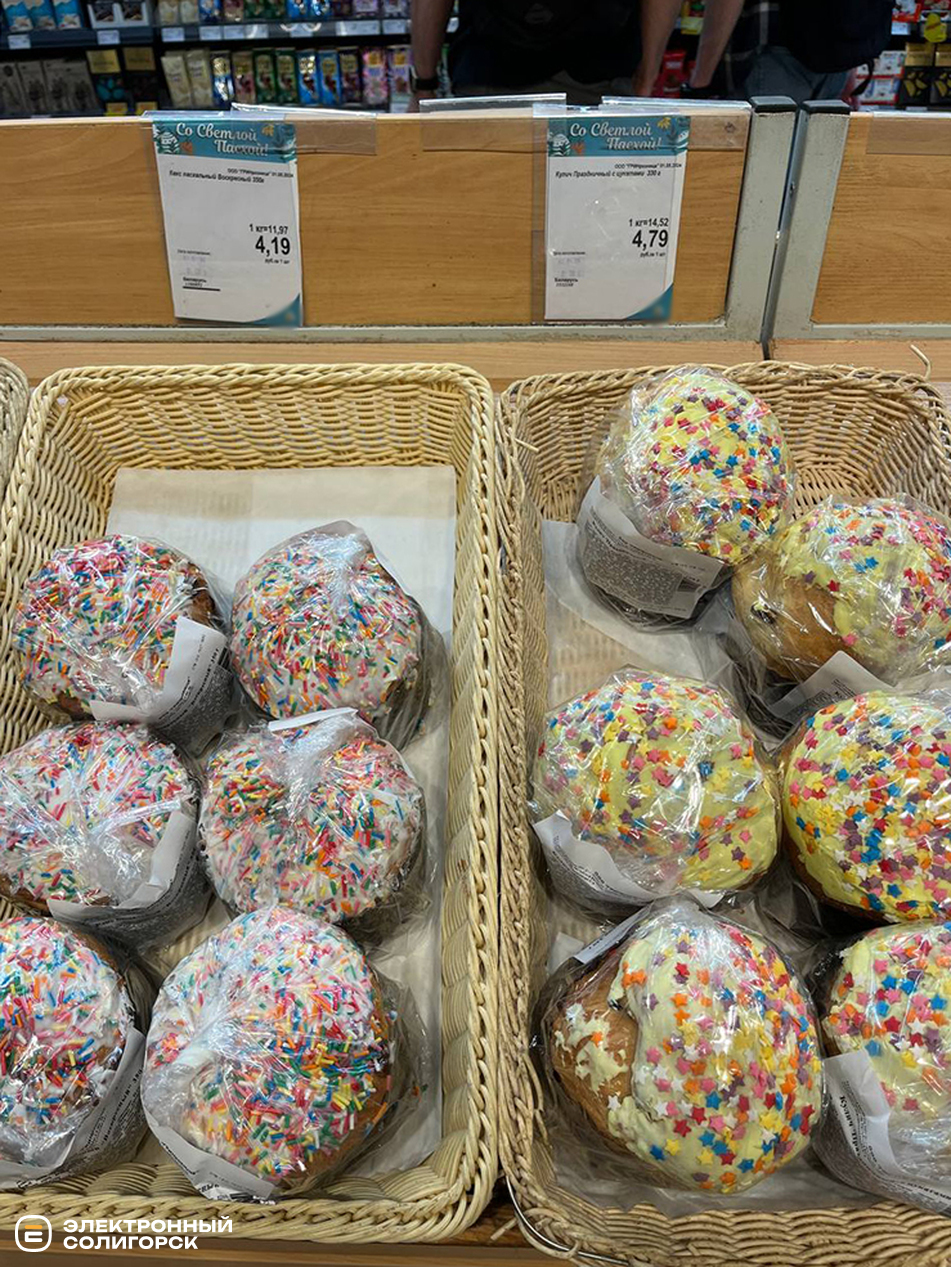 Ассортимент большой - праздничную продукцию разбирают быстро, продавцы торопятся подкладывать товар. Вес куличей - от 200 до 700 г, в зависимости от размера меняется и цена.