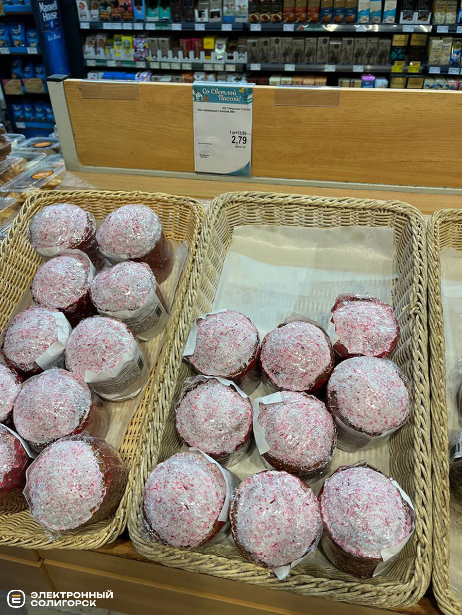 В одном из солигорских магазинов кулич "Весенний" весом 340 г стоит 4,99 руб., кулич с кленовым сиропом (380 г) - 6,99 руб., а кулич "Пасхальный" с изюмом весом 500 г стоит 5,99 руб. "Краффин с шоколадом" (350 г) увидели за 7,29 руб. и просто "Краффин" (320 г) тоже за 7,29 руб. Все они произведены в Минской области.