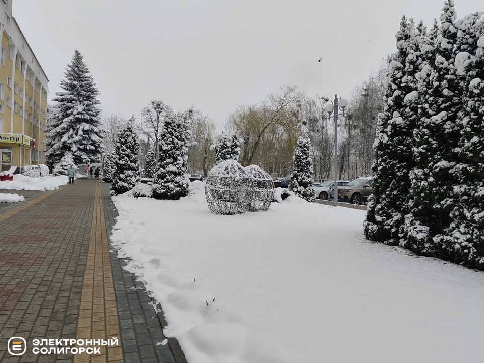 В Солигорск после нескольких теплых дней резко похолодало и выпал снег. Город преобразился: дети с восторгом играют в снежки, а коммунальные службы экстренно занимаются расчисткой дорог и тротуаров.