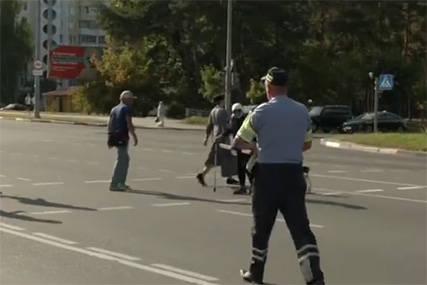 Милиционер, не теряя времени, подбежал к женщине и помог перейти дорогу.