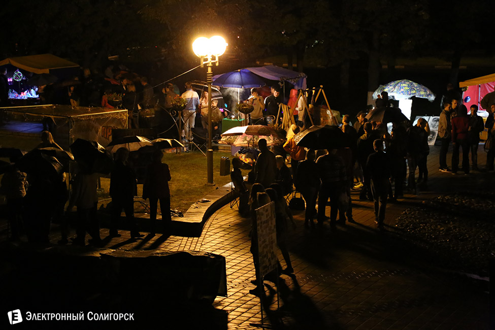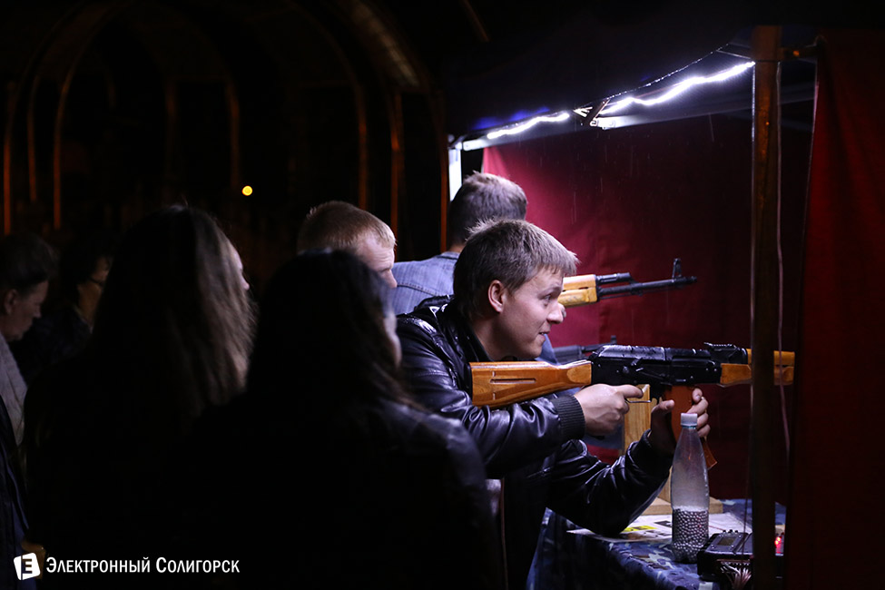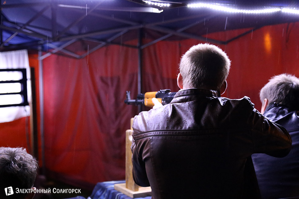 Пока на сцене только-только стартовала основная концертная программа, праздник с наступлением темноты продолжался и в Парке Четырех стихий. Накрапывающий дождь, вечерняя прохлада и близость осени - поводы, чтобы согреться хорошенько с помощью... разнообразных аттракционов, развернувшихся на аллеях парка. Стрельба в тире, карабкание по "веселой лестнице", устойчивость на крутящемся турнике, метание дротиков - к некоторым аттракционам даже выстраивались очереди.