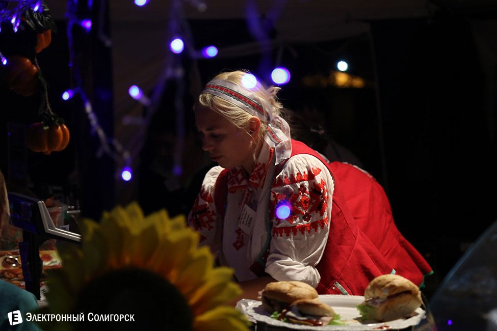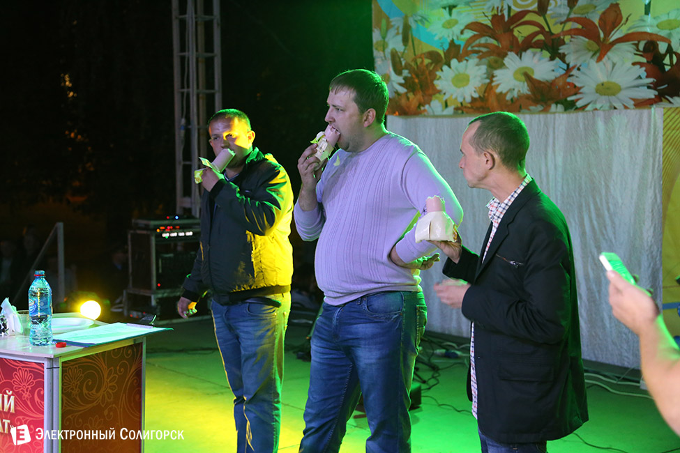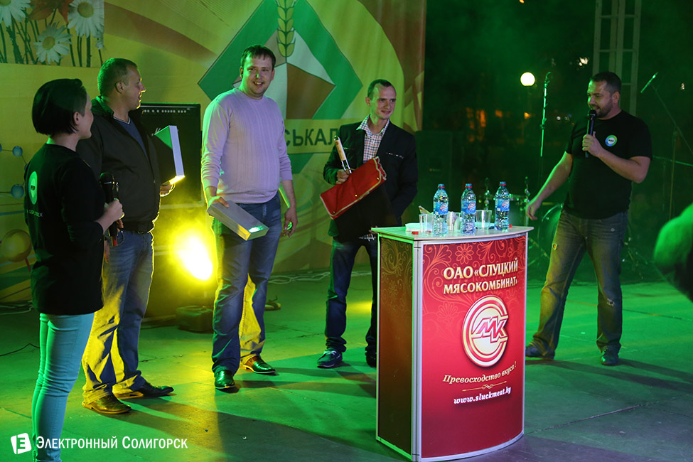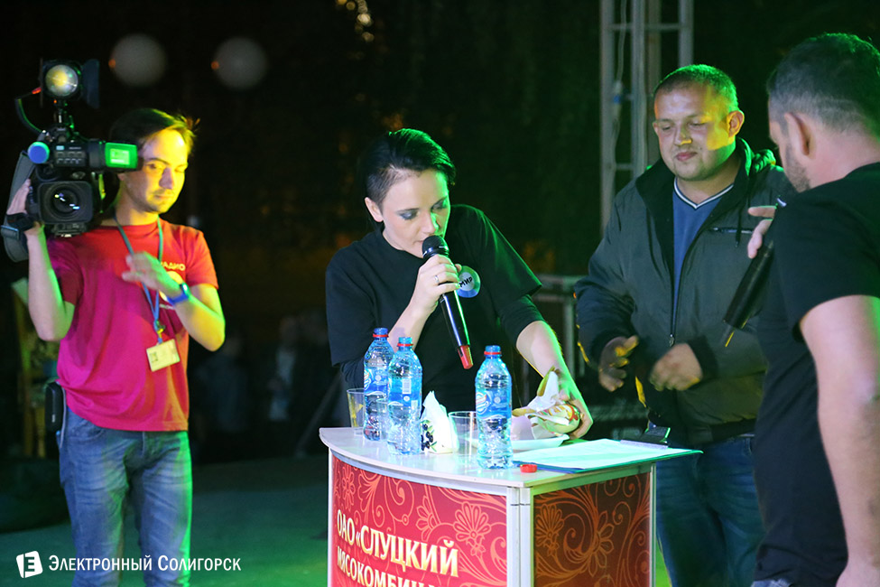 Любопытный конкурс предложили ведущие дискотеки от спонсора мероприятия - Слуцкого мясокомибината. Трем добровольцам необходимо было на скорость съесть по батону колбасы от указанного производителя.